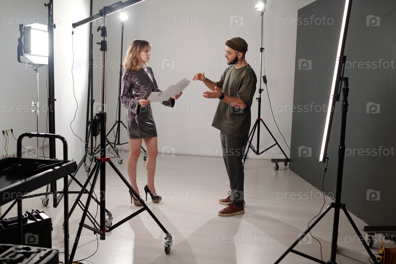 Молодая женщина разговаривает с режиссером за кулисами