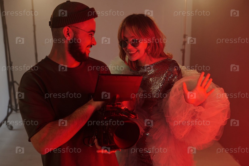 Молодая женщина и режиссер рассматривают кадры за кулисами во время съемок видео
