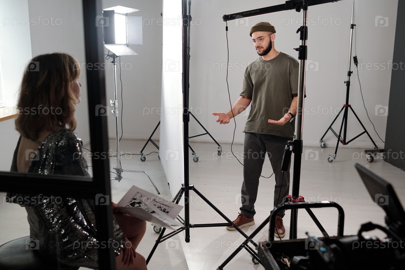 Режиссер дает инструкции непризнанной женщине во время съемки видео Мужчина
