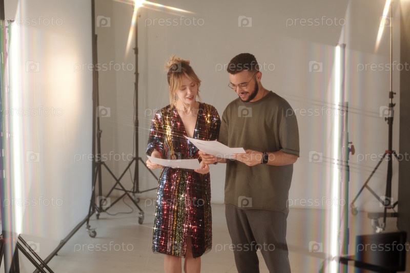 Улыбающаяся женщина консультируется с режиссером за кулисами