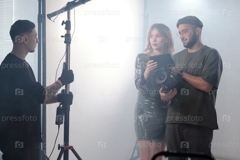 Женщина и режиссер рассматривают кадры на мониторе
