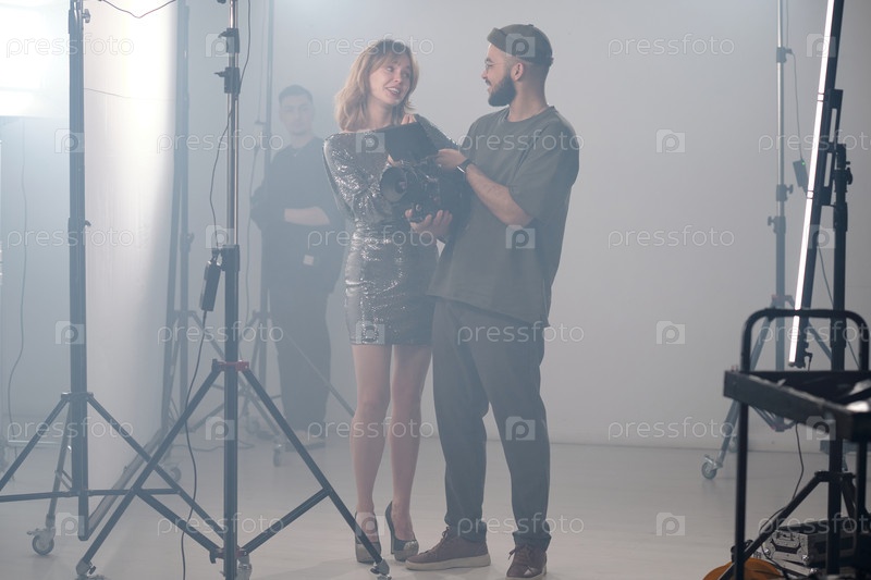 Съемочная группа с женщиной и режиссером, рассматривающими кадры