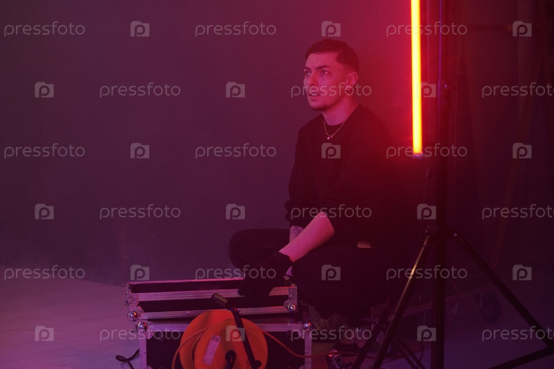 Помощник по производству сидит на корпусе оборудования под красным огнём