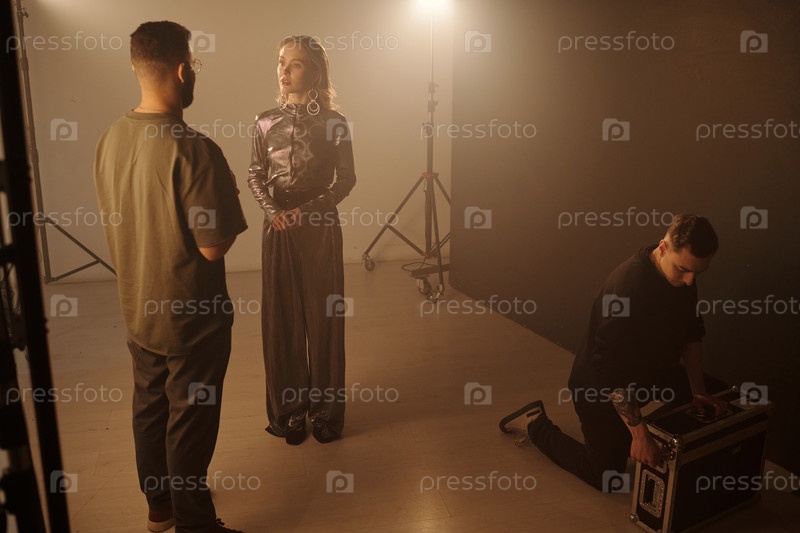Режиссер разговаривает с актрисой за кулисами и объясняет сцену