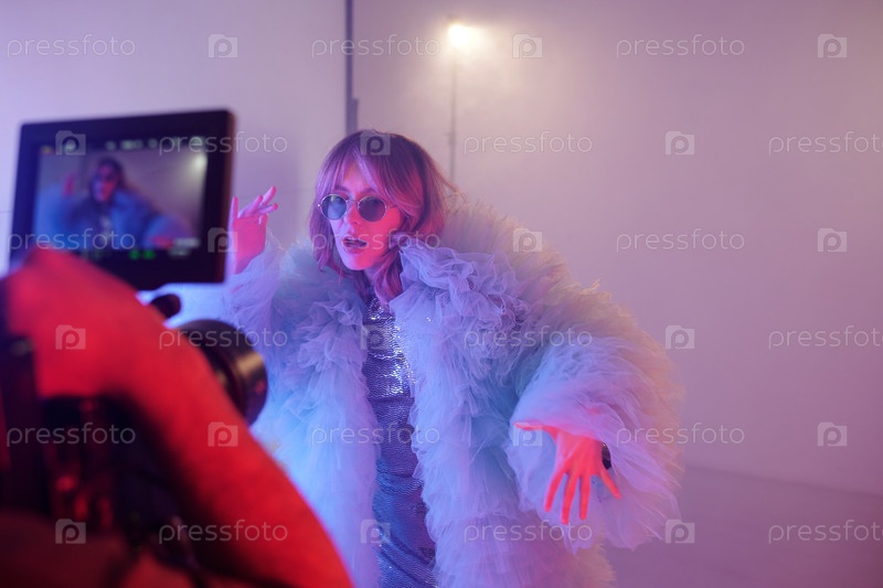 Молодая женщина выступает в костюме во время съемок видео