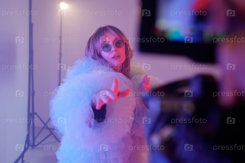 Женщина, выступающая перед камерой и носящая костюм