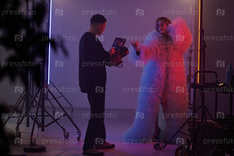 Настройка съемочной студии с женщиной, выступающей в костюме