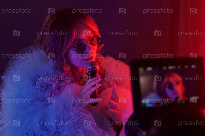Молодая женщина держит микрофон во время съемок музыкального видео