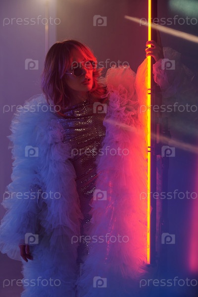 Молодая женщина стоит у световой ленты неона во время видеосъемки