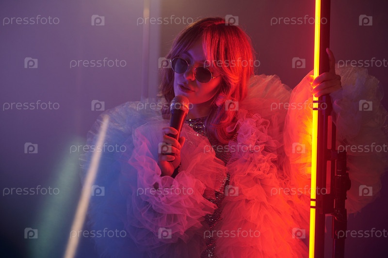 Молодая женщина, держащая микрофон, выступает во время съемок видео
