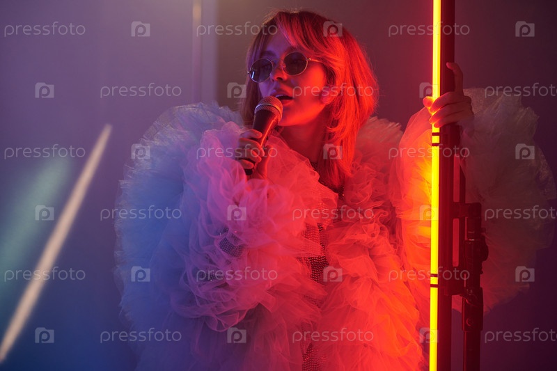 Молодая женщина поет в микрофон под красочным студийным освещением