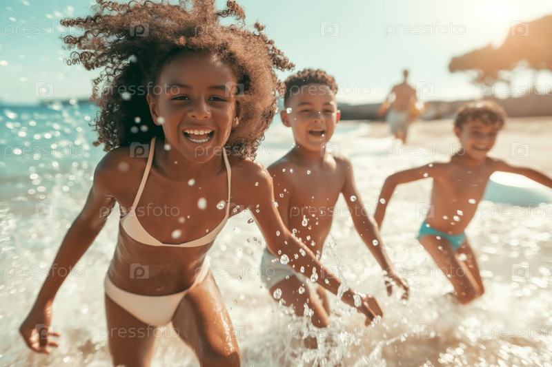 Дети наслаждаются пляжем в летнем солнечном свете
