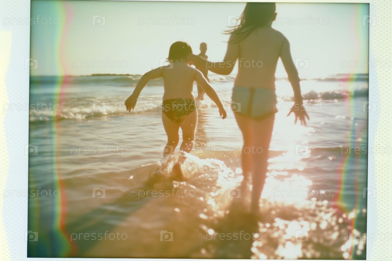 Дети играют в мелководной воде океана на закате