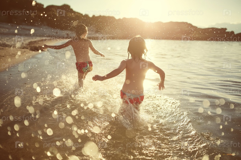 Дети играют в воде на солнечном пляже вечером