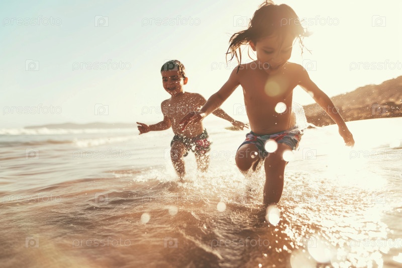 Дети играют в морской воде под ярким солнечным светом