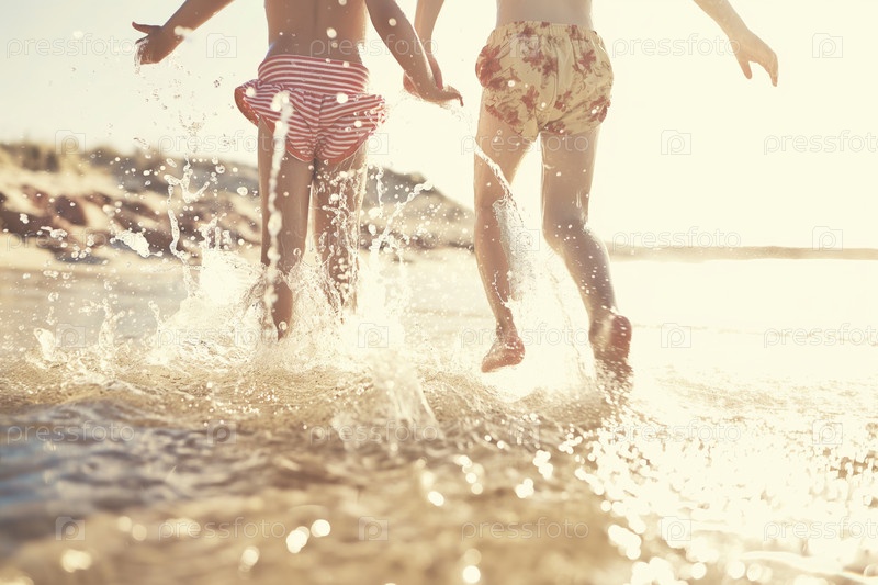 Дети играют и брызгут в мелкой пляжной воде