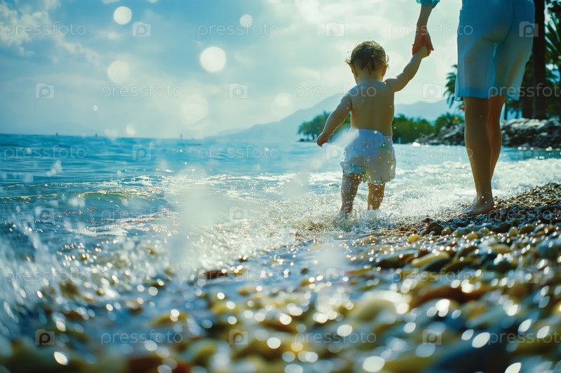 Держась за руки с ребенком во время прогулки по пляжу