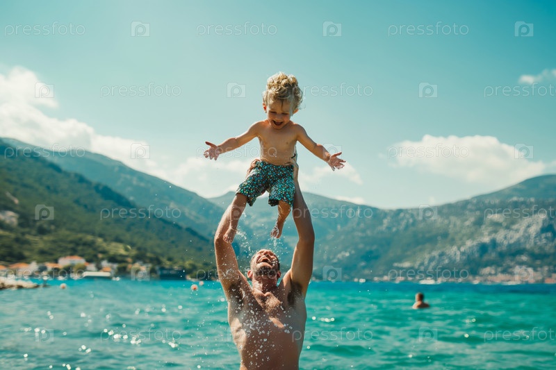 Наслаждаться солнечным днем на берегу моря с ребенком