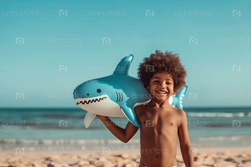 Наслаждаясь веселым днем на пляже с надувной акулой