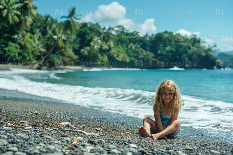 Молодая девушка, сидящая на Пебл-Бич и улыбающаяся перед камерой
