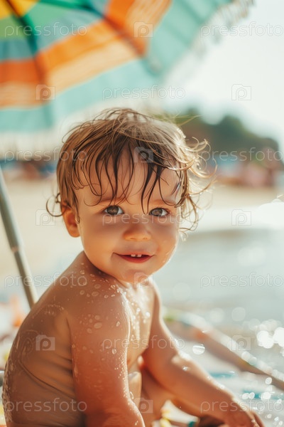 Улыбающийся ребенок сидит под пляжным зонтиком в солнечный день