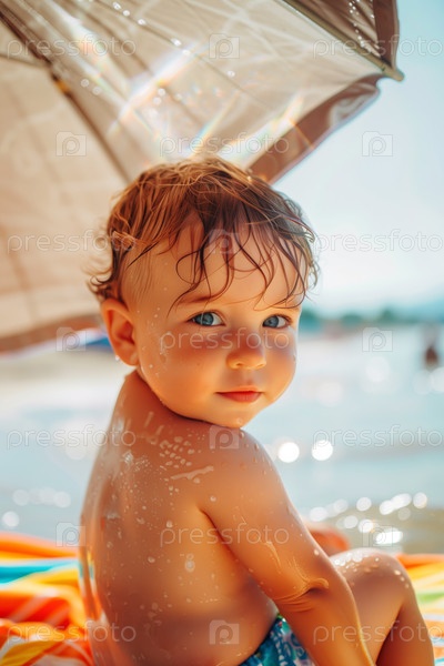 Очаровательный ребенок наслаждается солнечным днем на пляже под зонтиком