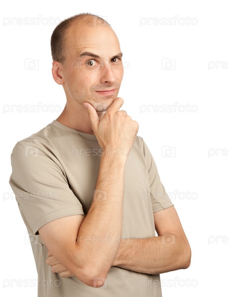 Смешной размышляющий мужчина на белом фоне