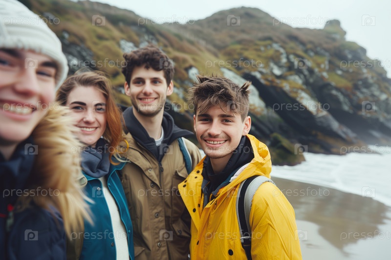 Улыбающиеся друзья исследуют живописный прибрежный ландшафт