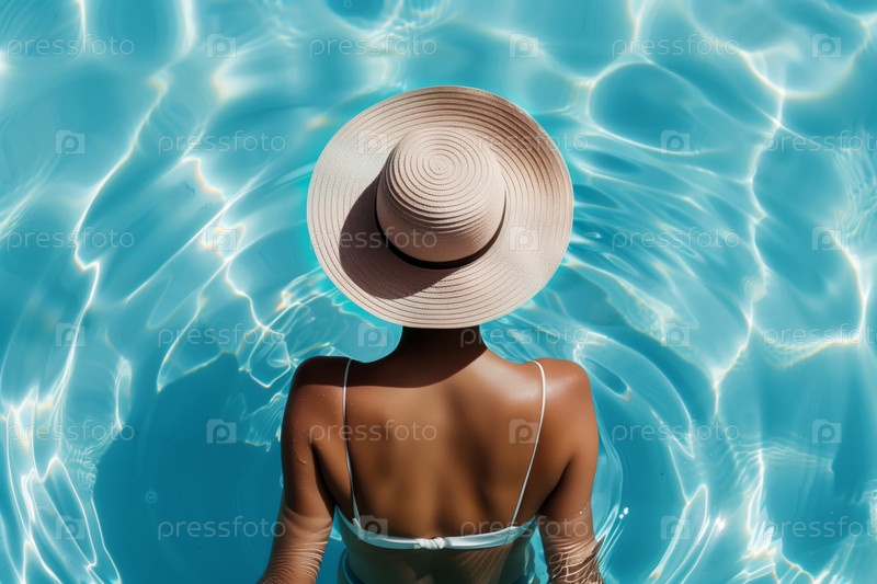 Отдых в бассейне под солнцем с большой шляпой