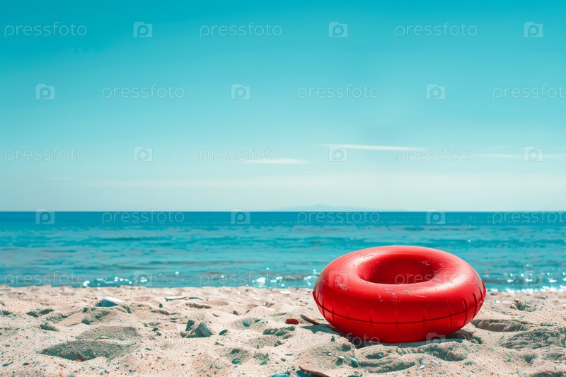 Расслабляющий день с красным кольцом плавания на песчаном пляже