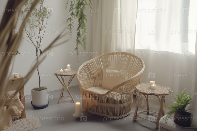 Уютная минималистическая гостиная с тканевой мебелью и растениями