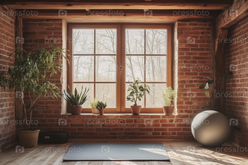 Спокойная домашняя йога-студия с большими окнами, позволяющими солнечный свет