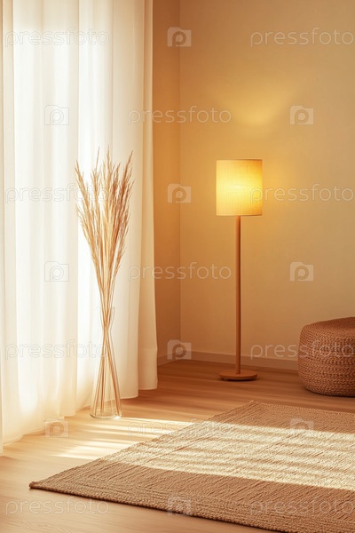 Спокойная минималистическая гостиная с теплым освещением