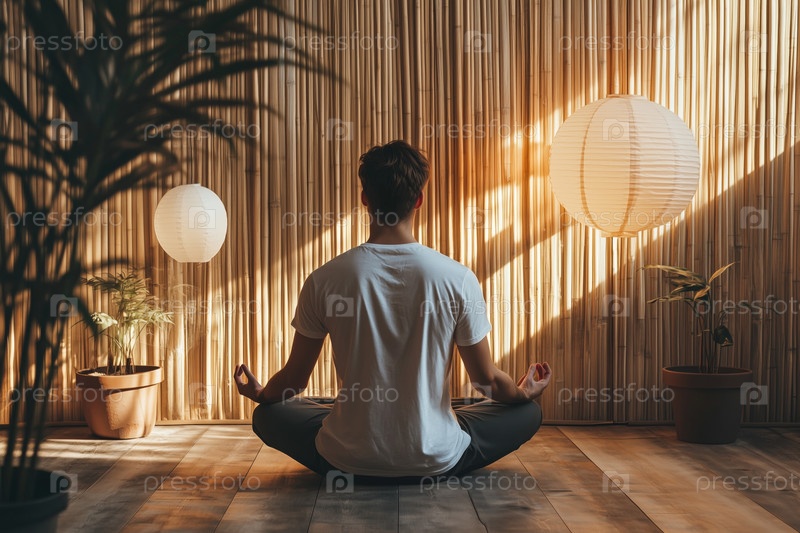 Медитация в мирной помещенной обстановке с бамбуковым фоном