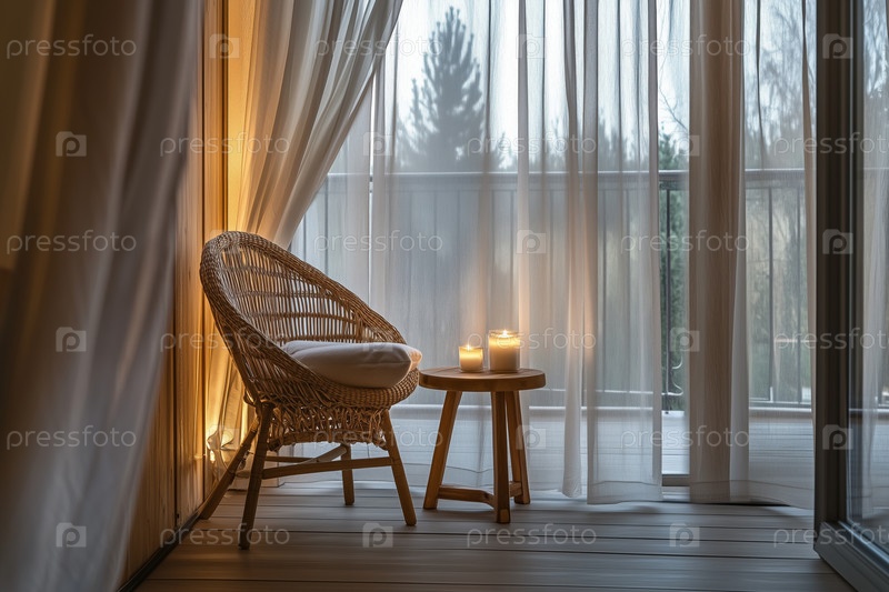 Расслабляющий уголок со свечами и виковым стулом возле окна