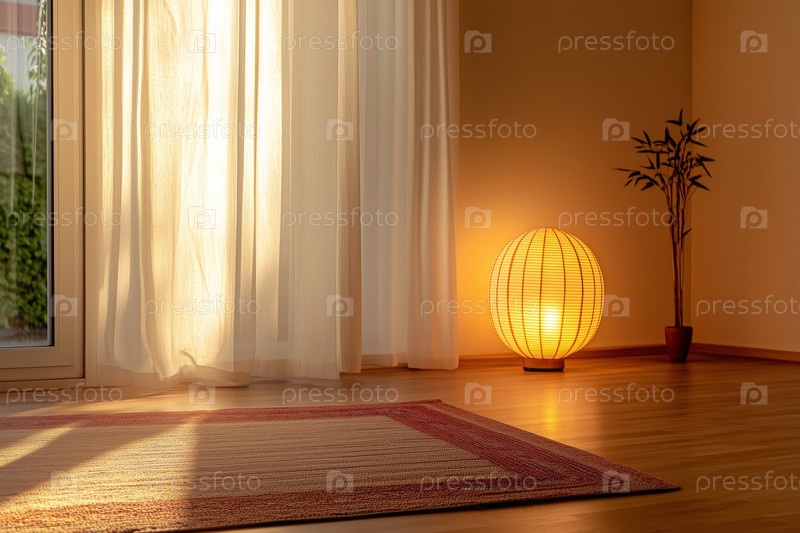 Солнечный уютный интерьер с занавеской и бамбуковой лампой
