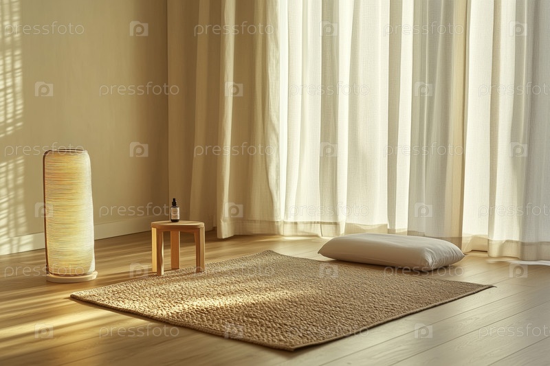 Солнечная минималистическая комната с напольным ковриком и подушкой