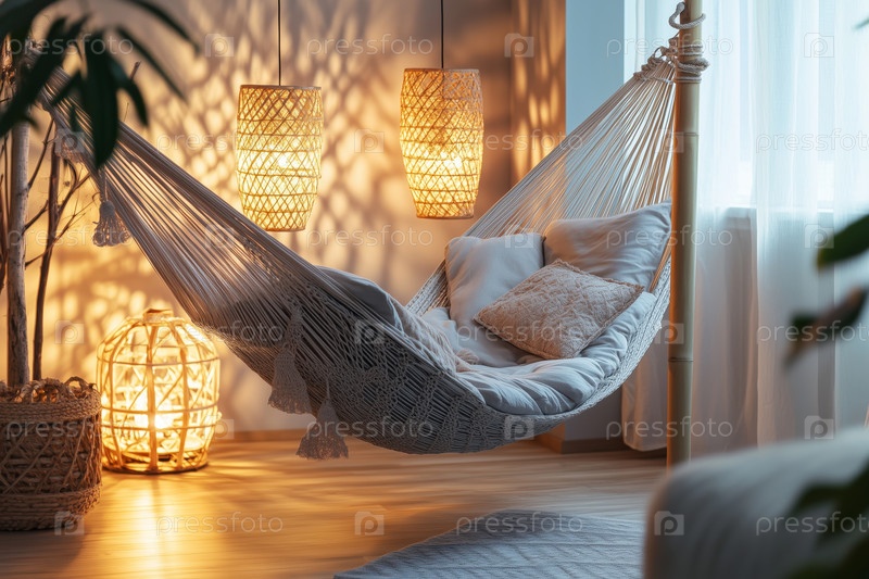 Уютная гамаковая сцена с естественным светом и ратанными акцентами