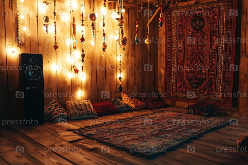 Тепло освещенная уютная богемная комната, украшенная подушками