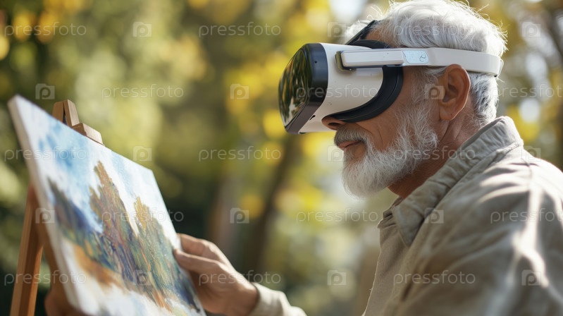 Старший мужчина рисует на открытом воздухе, используя гарнитуру виртуальной реальности