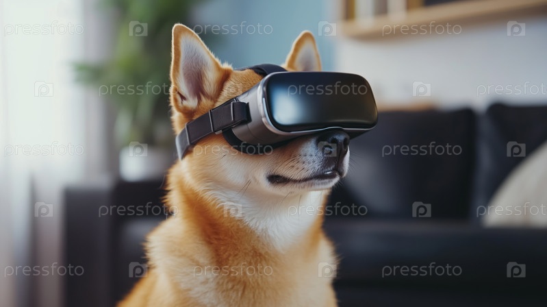 Собака, носящая гарнитуру виртуальной реальности в помещении