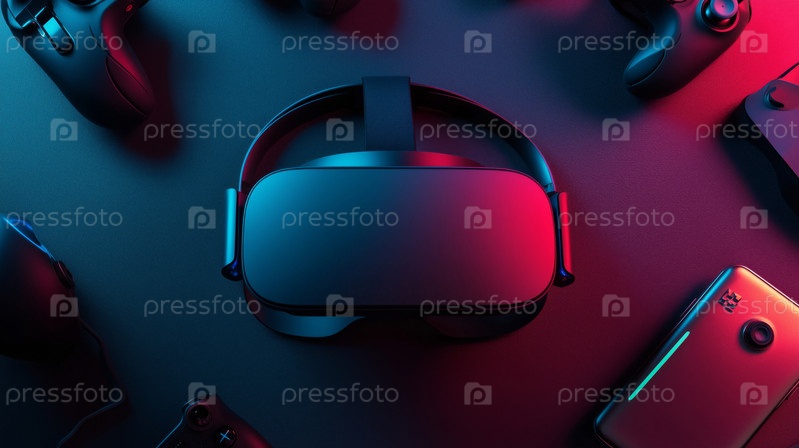 Современный VR гарнитур, окруженный игровыми контроллерами