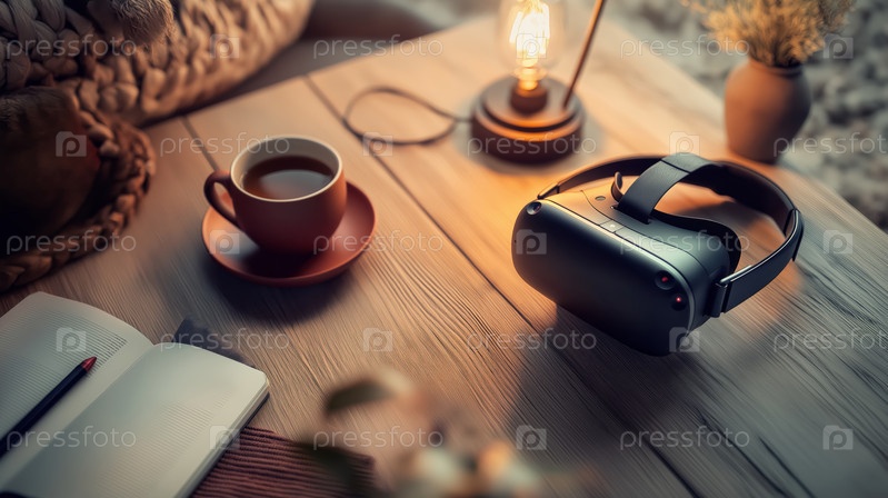 Опыт виртуальной реальности с кофе и лампой на столе
