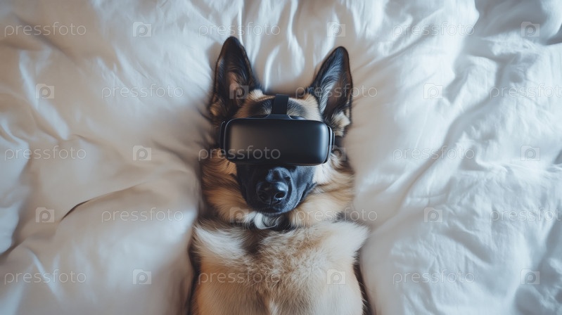 Расслабляющая немецкая овчарка, носящая технологический гаджет в постели