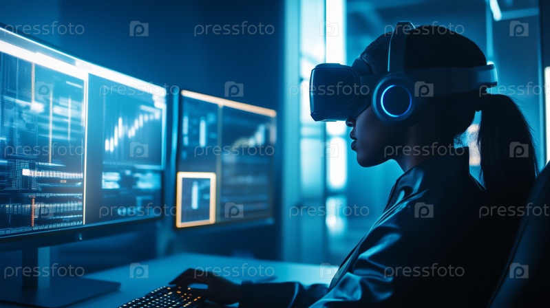 Женщина, использующая технологию VR для анализа данных в офисе