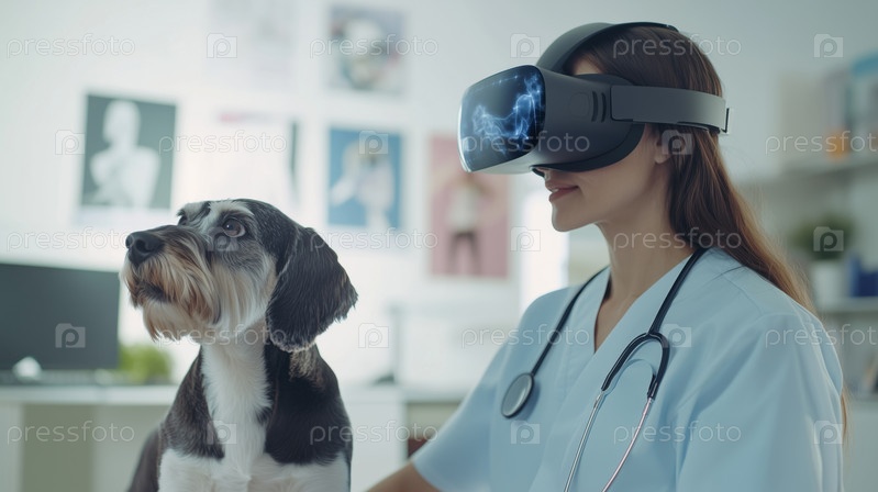 Ветеринар, носящий оборудование виртуальной реальности и осматривающую собаку