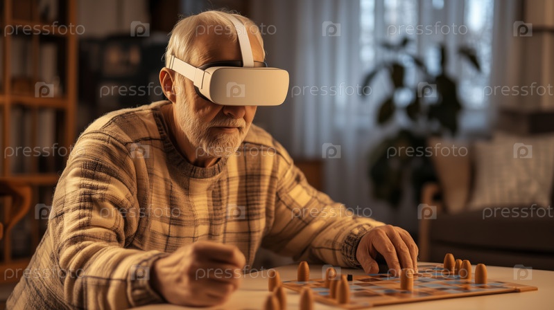 Пожилой мужчина, носящий гарнитуру VR и играющий в шахматы