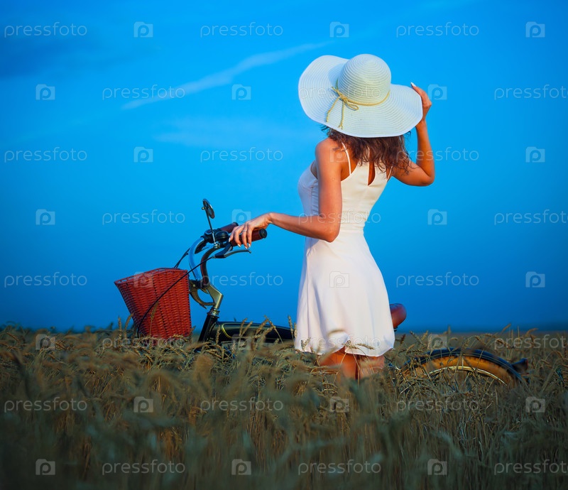 Красивая девушка в белом платье и шляпе с велосипедом на пшеничном поле