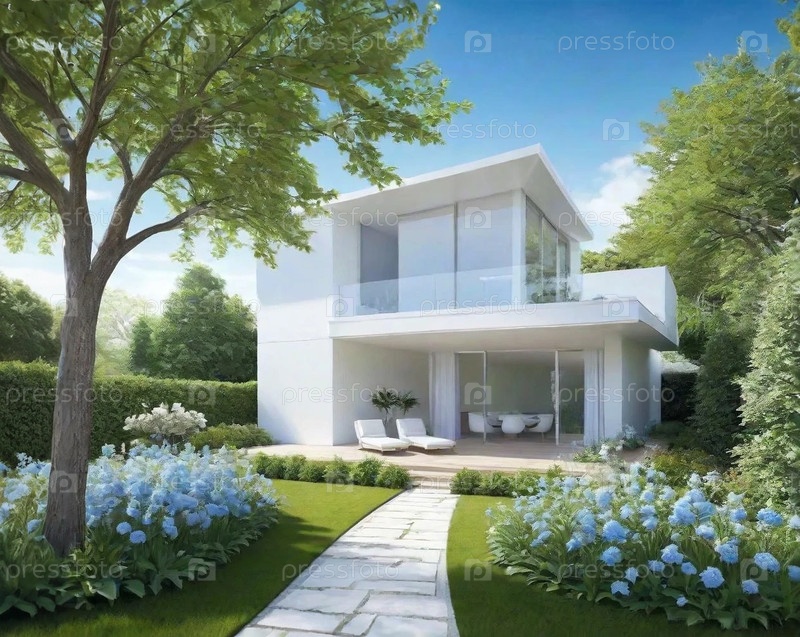 Двухэтажный стильный дом в облагороженном саду с цветами деревьями