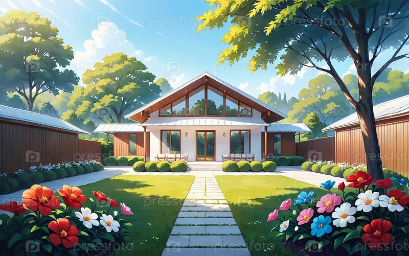 Двухэтажный стильный дом в облагороженном саду с цветами деревьями
